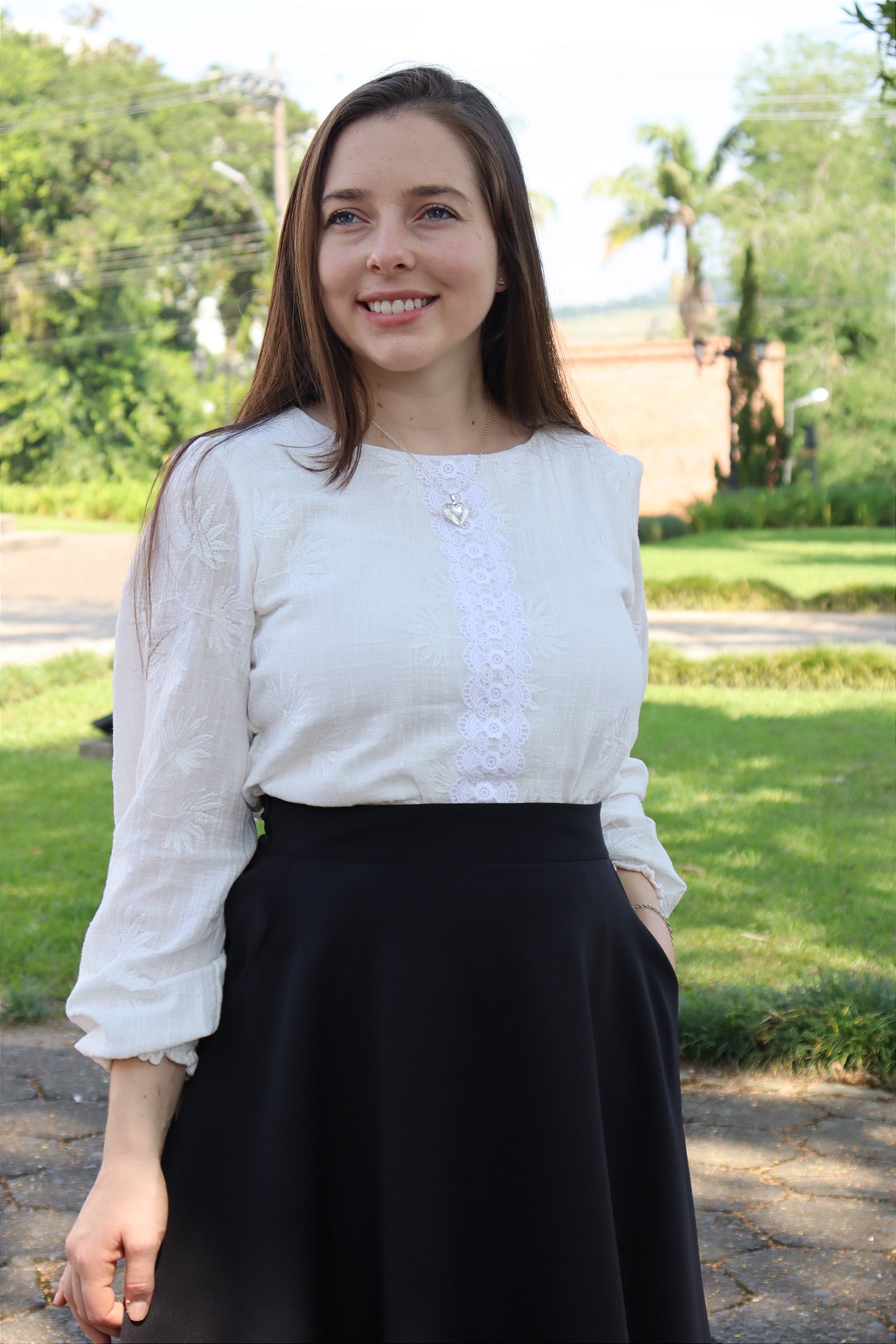 Descrição: Blusa branca de mangas compridas com elástico no punho, confeccionada em algodão bordado e com detalhe em renda na parte da frente. Possui alguns botões na parte de trás. Não tem transparência no corpo (frente e costas), pois é forrada em viscose.