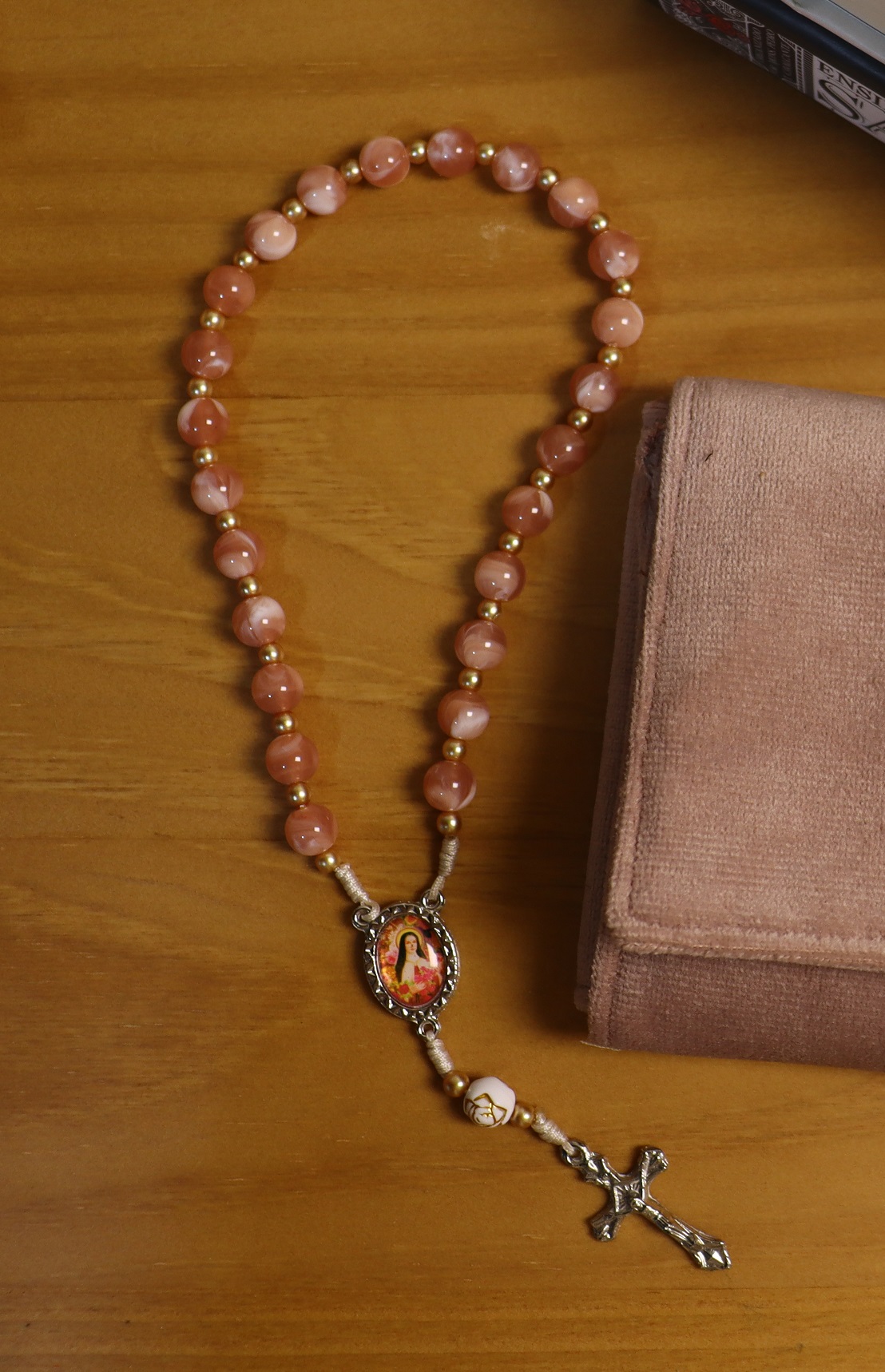Descrição: A coroa foi confeccionada com contas na cor rosê e com cordão resistente. Cruz e medalha na cor ouro velho.
