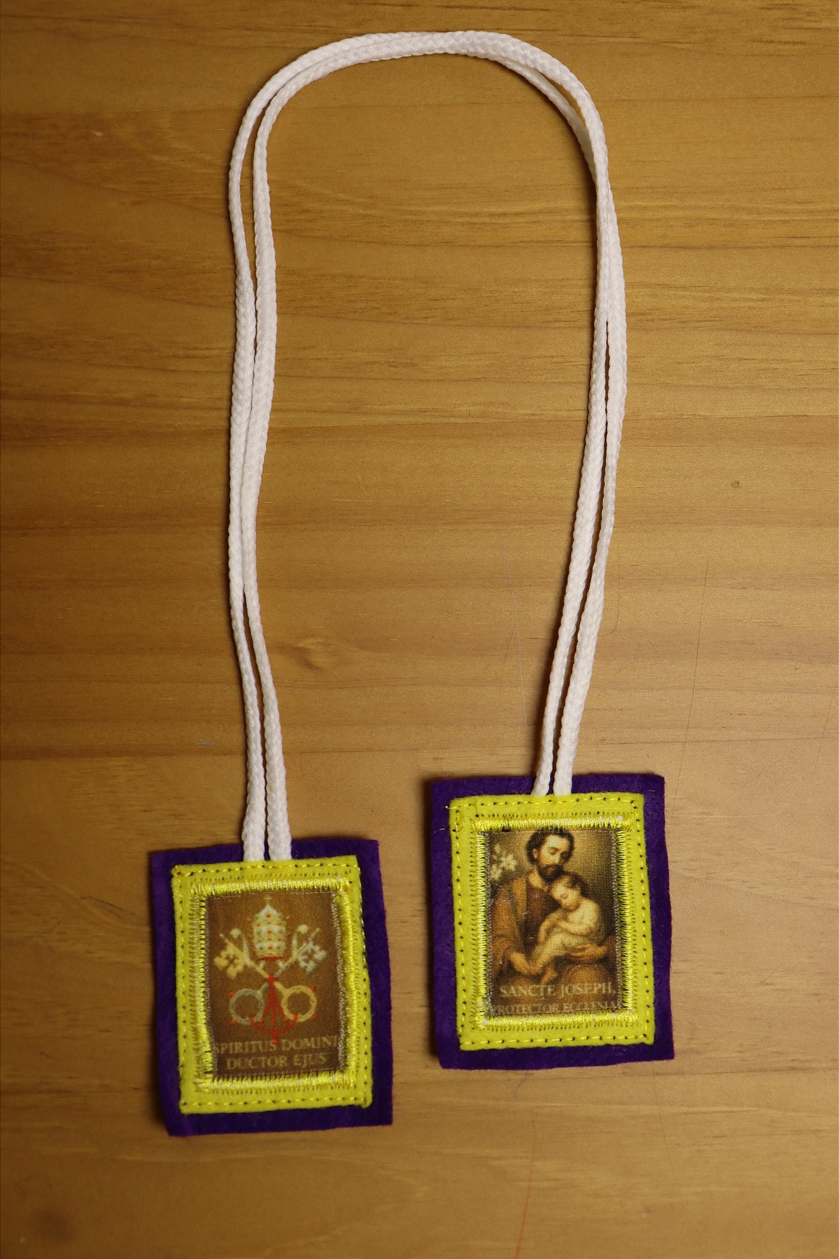 Escapulário de São José confeccionado em tecido com imagem sublimada em tecido. Medidas aproximadas: 5x4 cm.