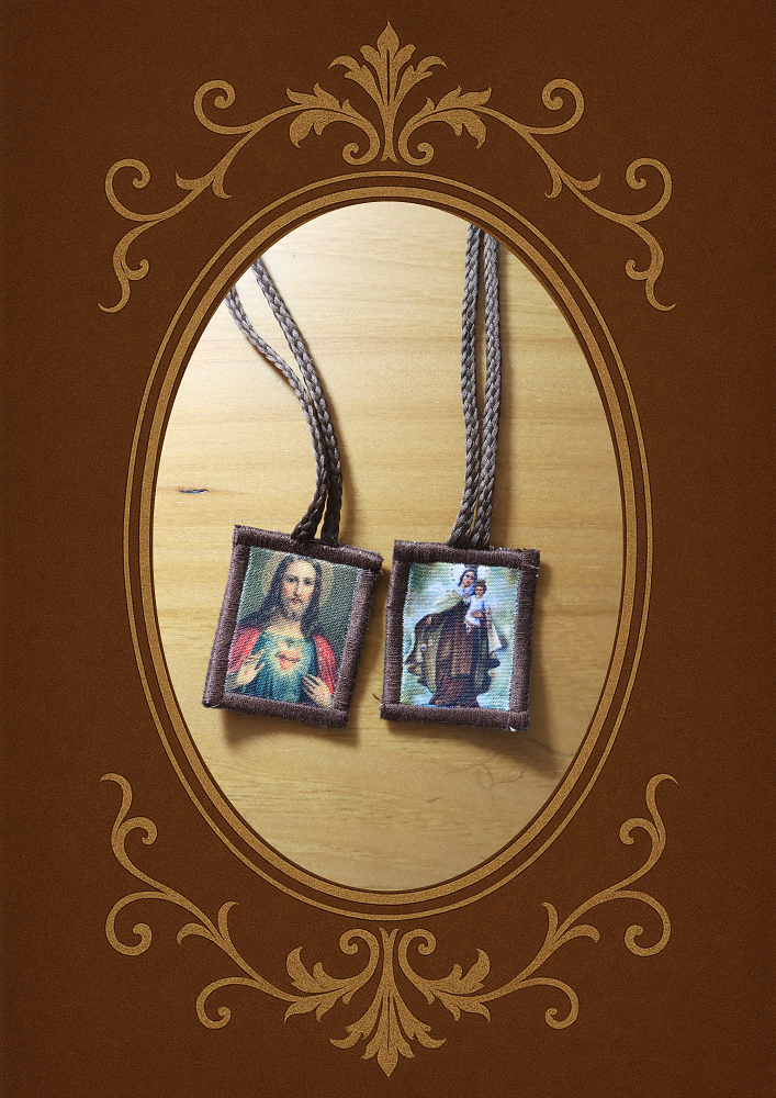 Produto acompanha folheto sobre o uso do escapulário.
