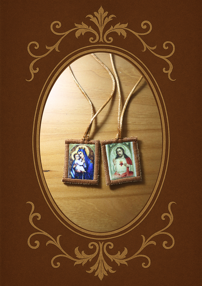 O Escapulário do Carmo (Modelo 3) é confeccionado em tecido de lã 100% natural de carneiro, possui a imagem do Sagrado Coração de Jesus e Nossa Senhora do Carmo, no modelo tradicional.