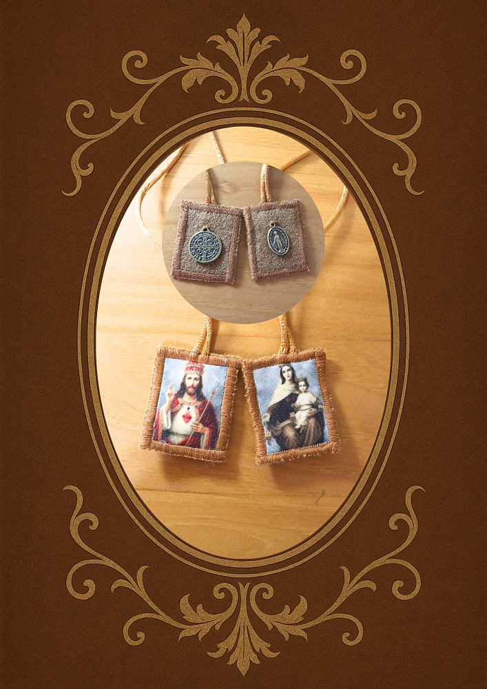 O Escapulário do Carmo (Modelo 4) é confeccionado em tecido de lã 100% natural de carneiro, possui a imagem do Sagrado Coração de Jesus e Nossa Senhora do Carmo, no modelo tradicional. O diferencial deste modelo é que ele acompanha a Medalha Milagrosa e medalha de São Bento, já colocadas na parte de trás do escapulário, como aparece na foto.