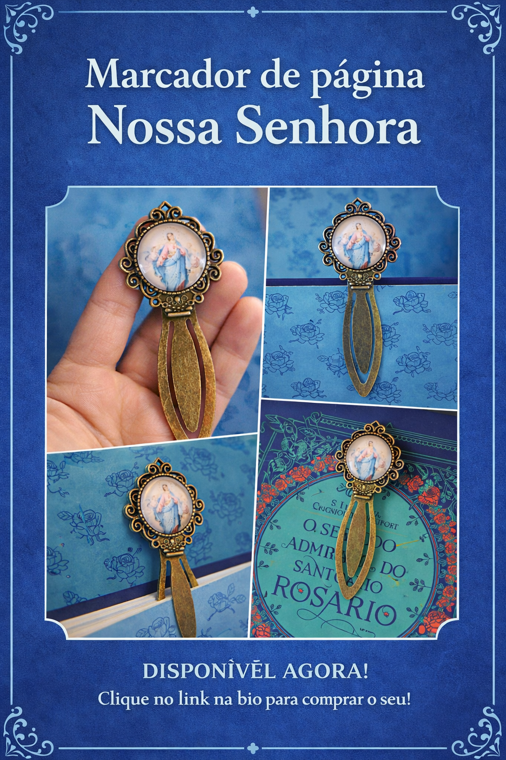 Descrição: Este marcador de página de metal é um pequeno e útil acessório que ajuda os leitores a marcar seus livros. Feito com material resistente e personalizado com a imagem de Nossa Senhora, pode servir para marcar devocionários ou as Sagradas Escrituras também.