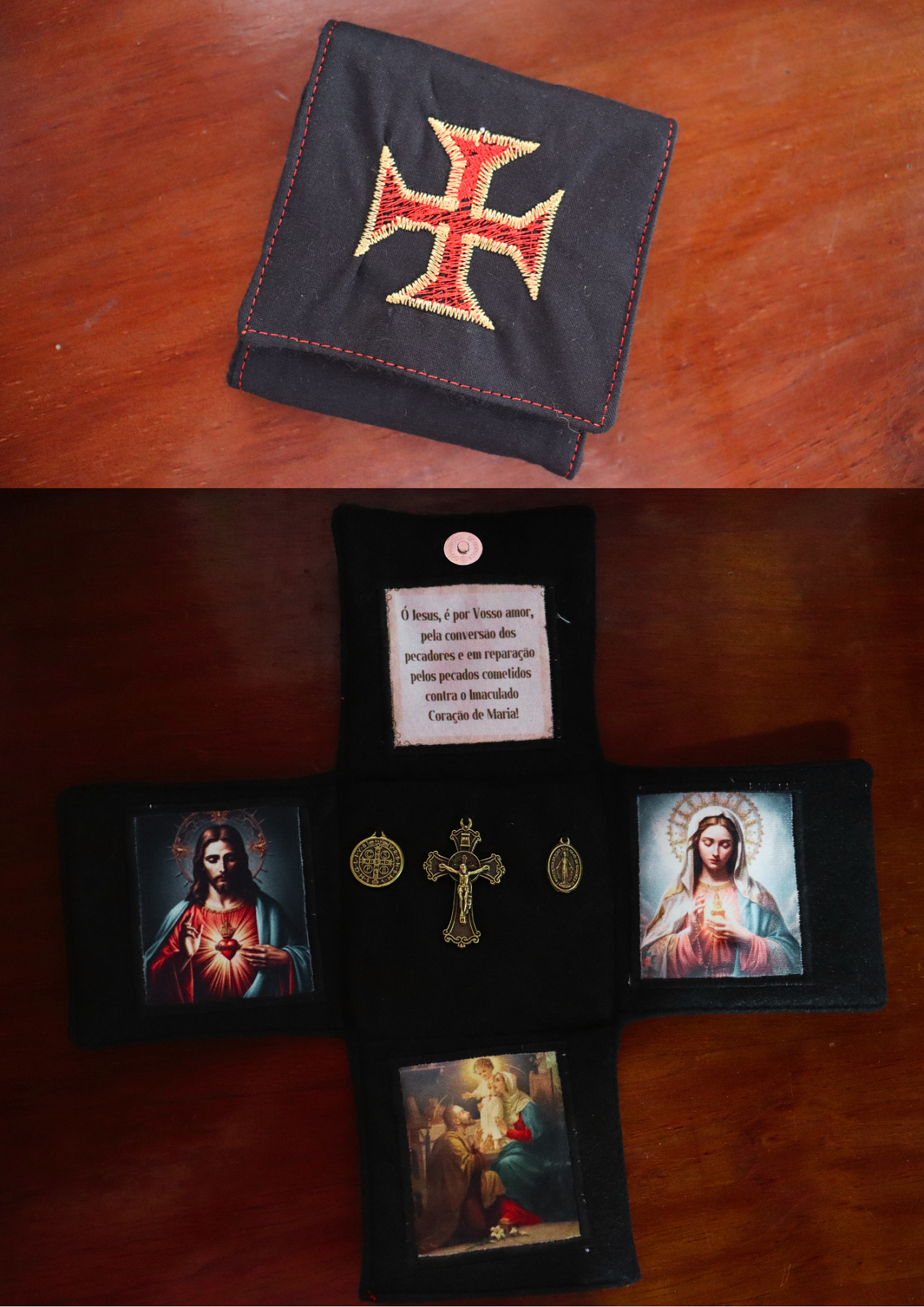 Descrição do produto: Oratório de bolso em formato de cruz confeccionado em tecido com imagens sublimadas em tecido.