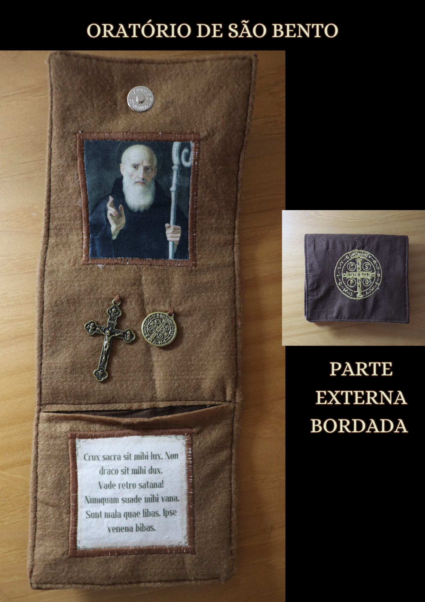 Oratórios de bolso são como uma mini capela, são próprios para serem levados em viagens ou quando se vai sair de casa. São feitos em tecido, com as orações também impressas em tecido, medalhas e imagens diferentes.