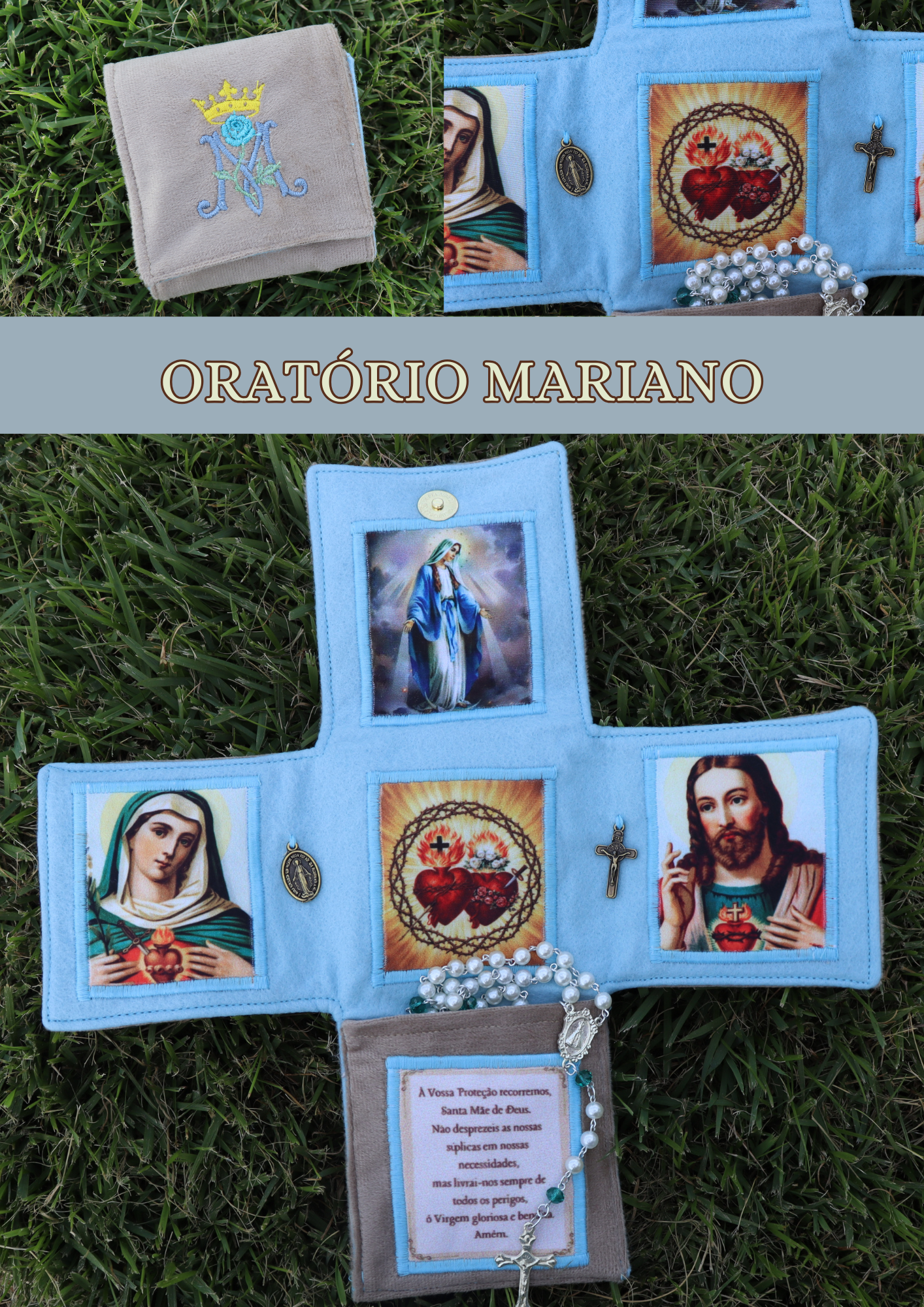 Oratórios de bolso são como uma mini capela, são próprios para serem levados em viagens ou quando se vai sair de casa. São feitos em tecido, com as orações também impressas em tecido, medalhas e imagens diferentes.
