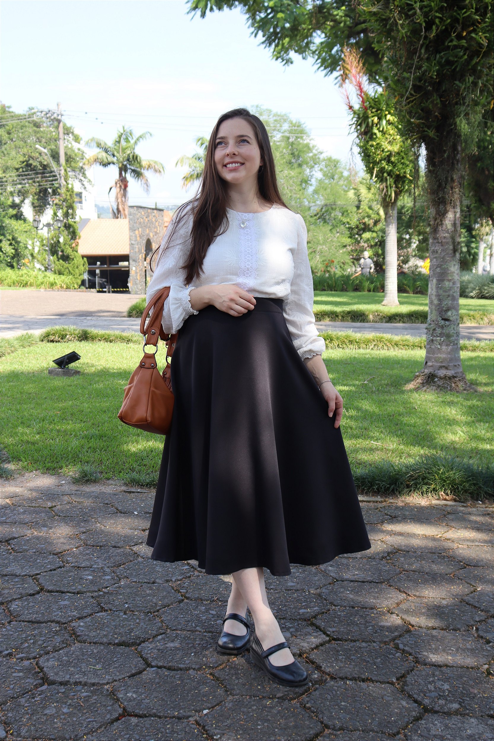 Descrição: Saia midi godê com bolsos e zíper na lateral