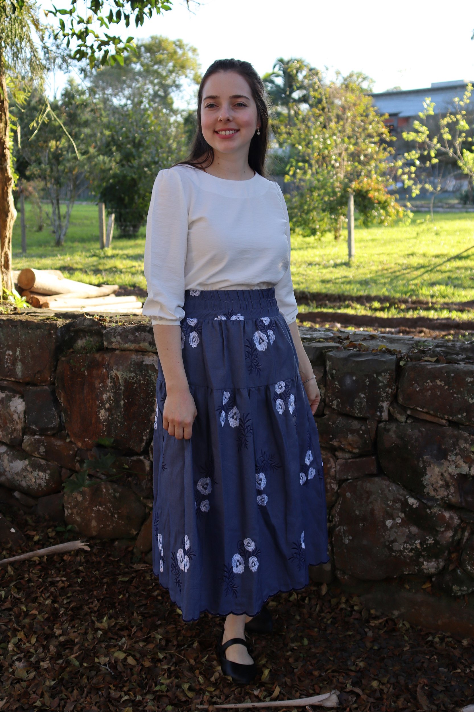 - Saia midi com uma maria e elástico em toda a cintura