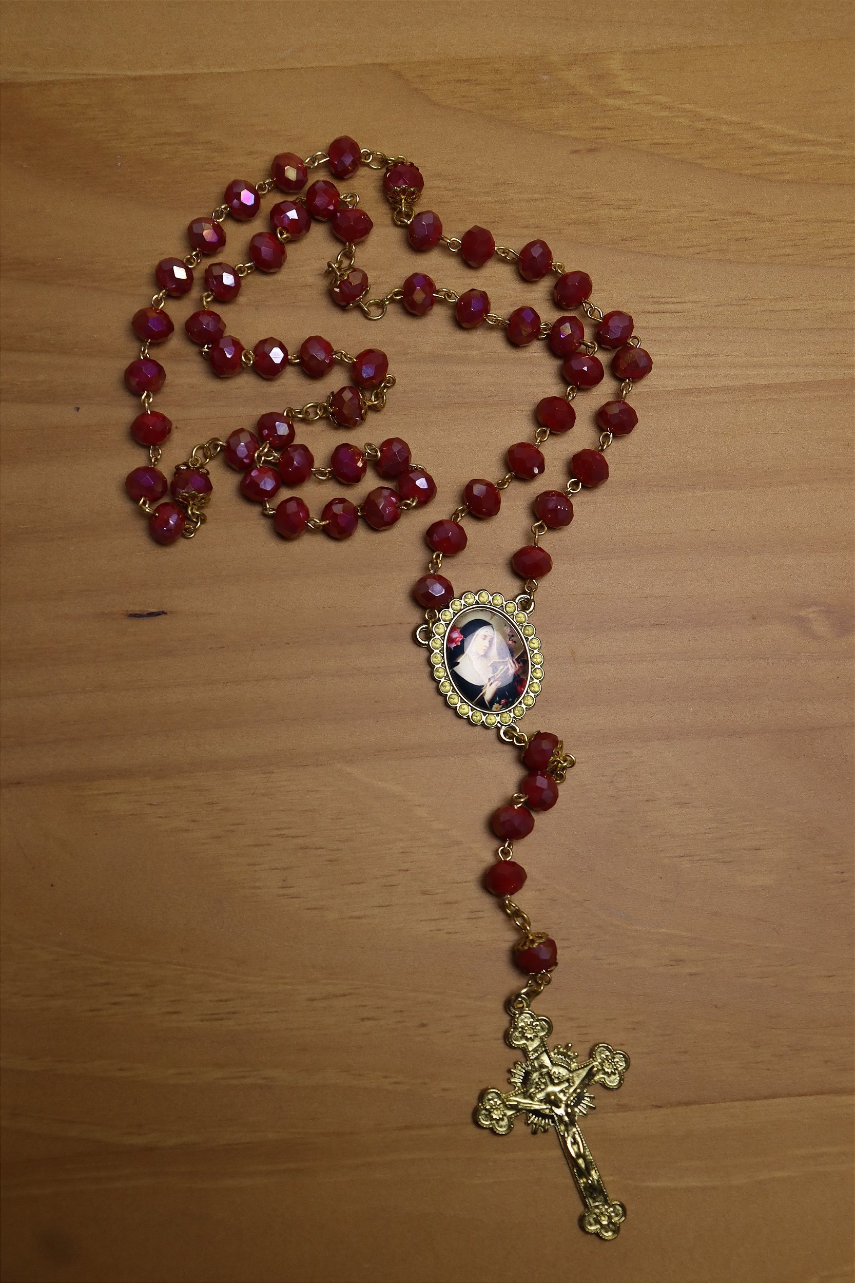 - Terço com contas 100% cristal de 8 mm com entremeio de Santa Rita de Cássia.
