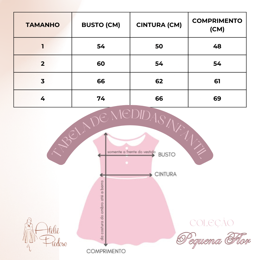 Disponível nos tamanhos 1, 2, 3 e 4, o Vestido Camélia é ideal para diversas ocasiões, combinando leveza, modéstia e o amor que as pequenas princesas merecem.