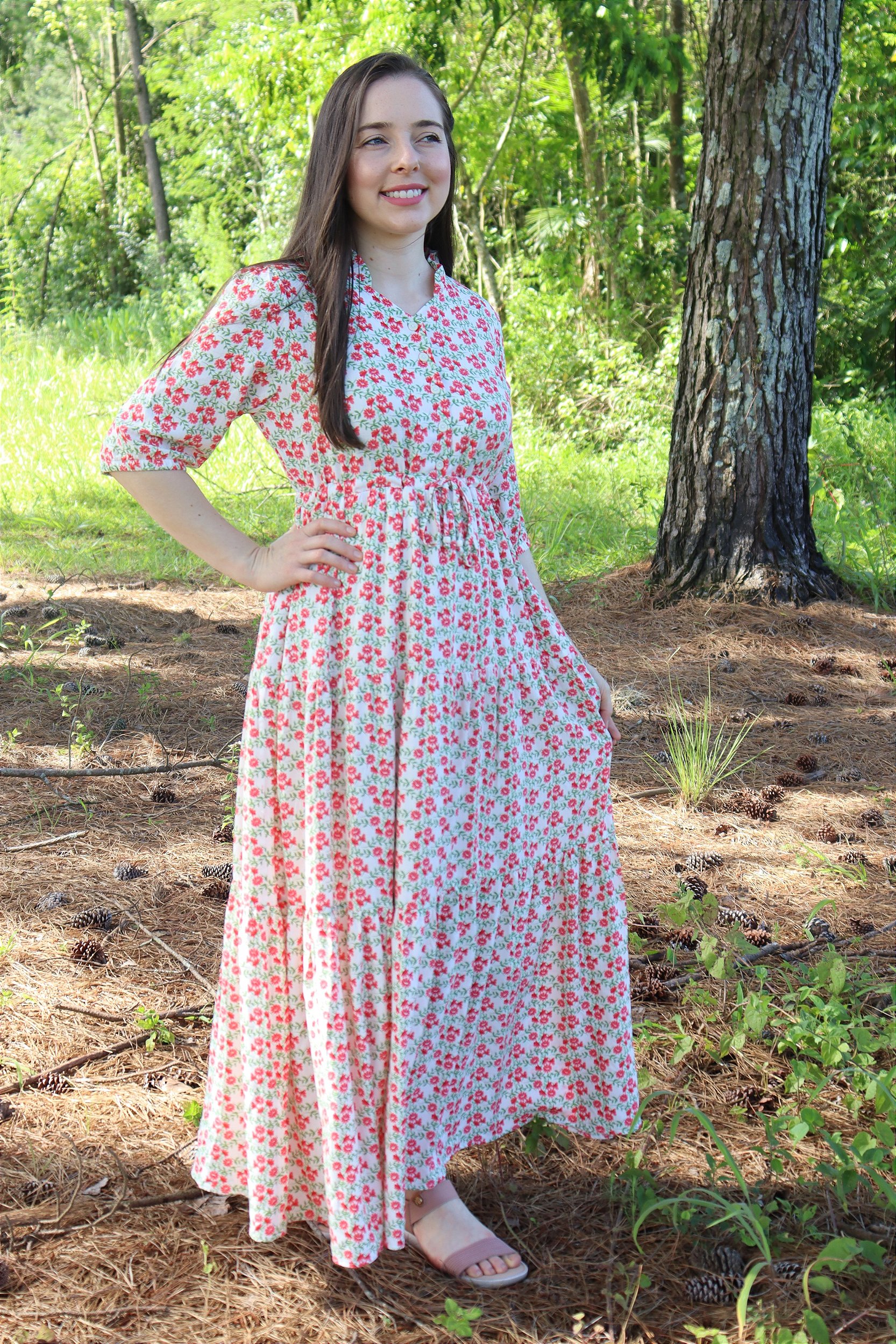 - Vestido confeccionado em viscolinho floral com saia três marias longa