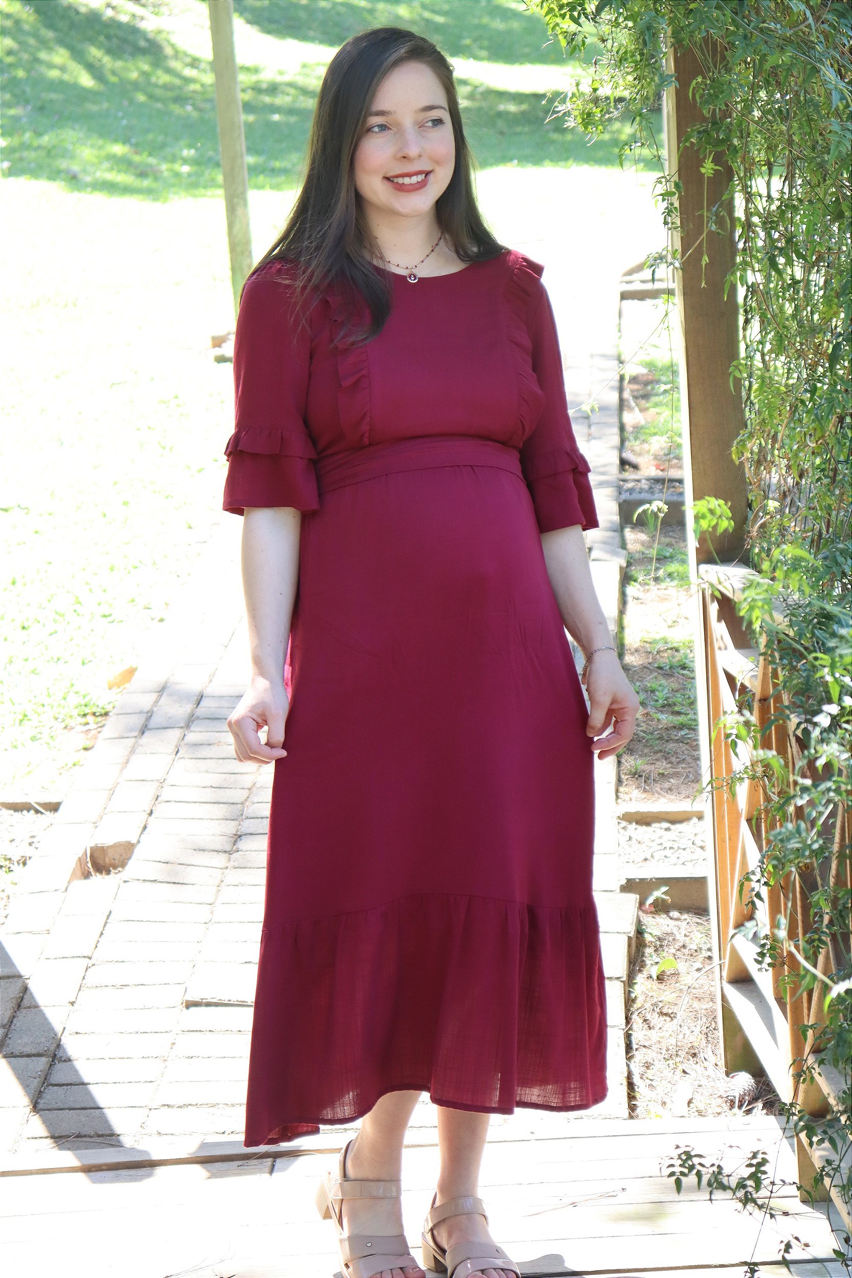 - Possui zíper para amamentação que fica oculto por baixo do babado