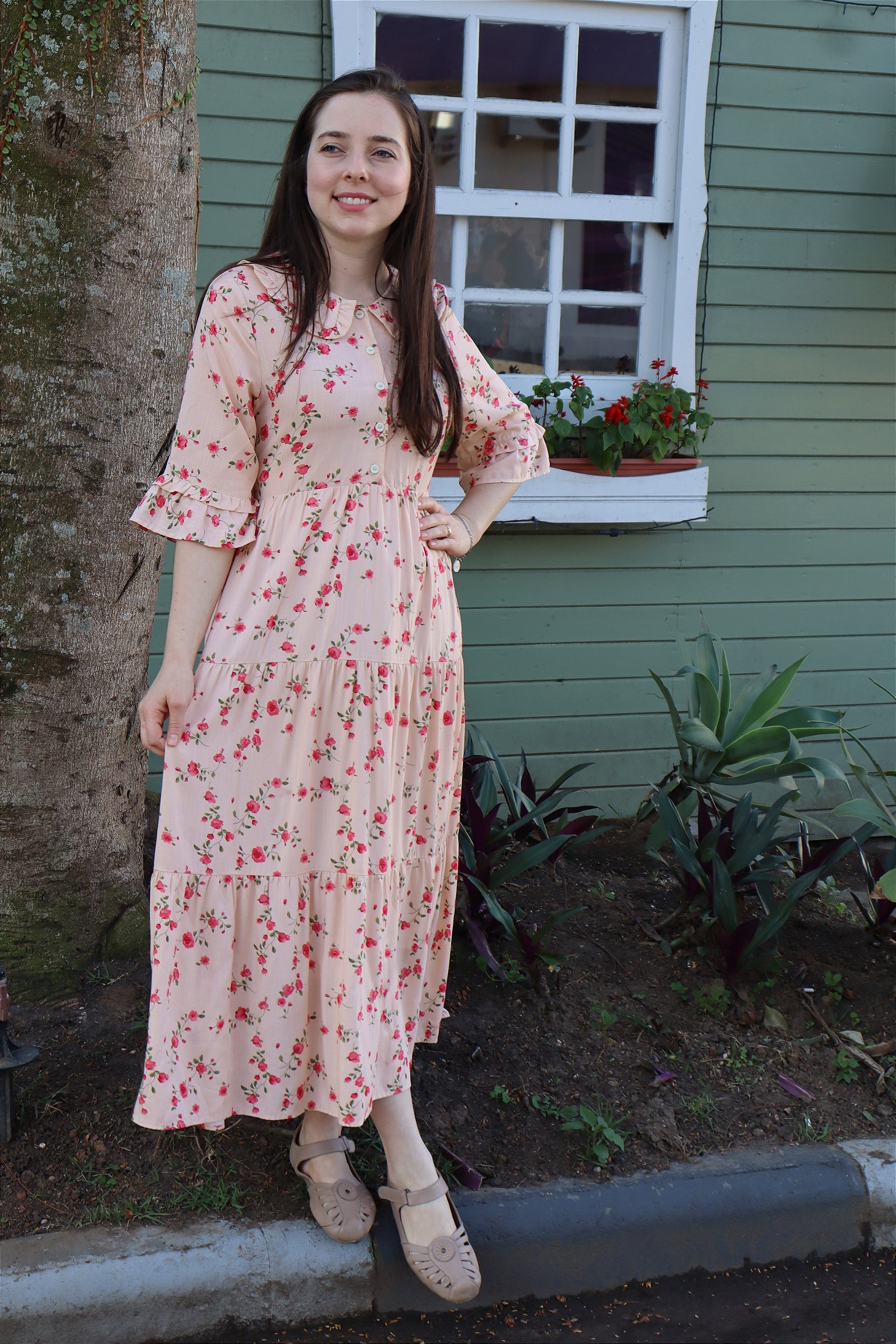 - Vestido confeccionado em viscolinho floral no comprimento maxi midi com saia três marias (comprimento da saia: 90 cm)