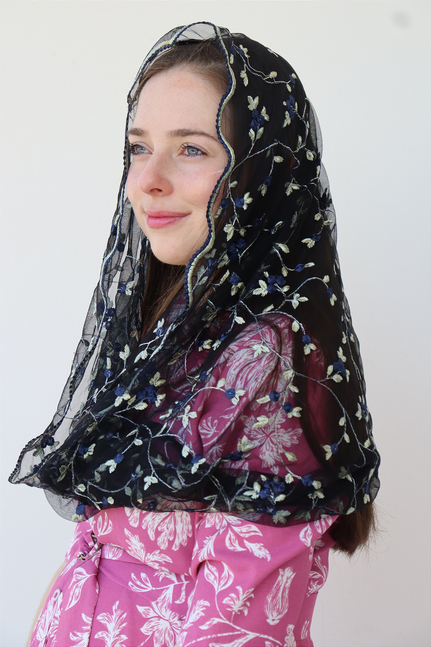 Descrição: Véu preto no modelo infinit (tipo uma gola), fabricado em renda com flores em relevo na cor azul, com acabamento em renda guipir.